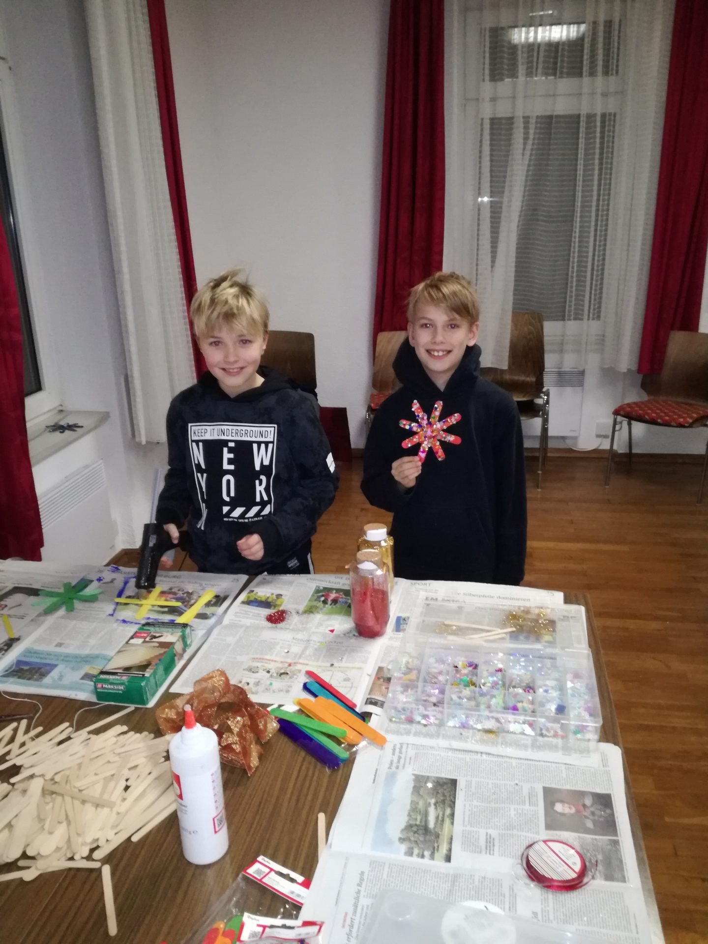 Für die Kinder wurde im oberen Stock des Rathauses durch Christel Schreiner und ihrer Tochter Hannah den Kindern wieder die Möglichkeit gegeben, sich kreativ zu beschäftigen. Es wurde aus Papptellern Türkränze sowie aus Holzstäbchen, die die Kinder selbst bunt anmalen und bekleben konnten, Sterne gebastelt. Auch im ehemaligen Sprechzimmer des Rathauses bot der TSV seinen älteren und natürlich auch jüngeren Gästen die Möglichkeit, sich in der warmen Stube bei Kaffee und Kuchen zu unterhalten. Ebenfalls beteiligte sich der Posauenchor mit einer kleinen Gruppe wieder an der Unterhaltung der Gäste, indem er einige weihnachtliche Lieder zur Unterhaltung spielte.