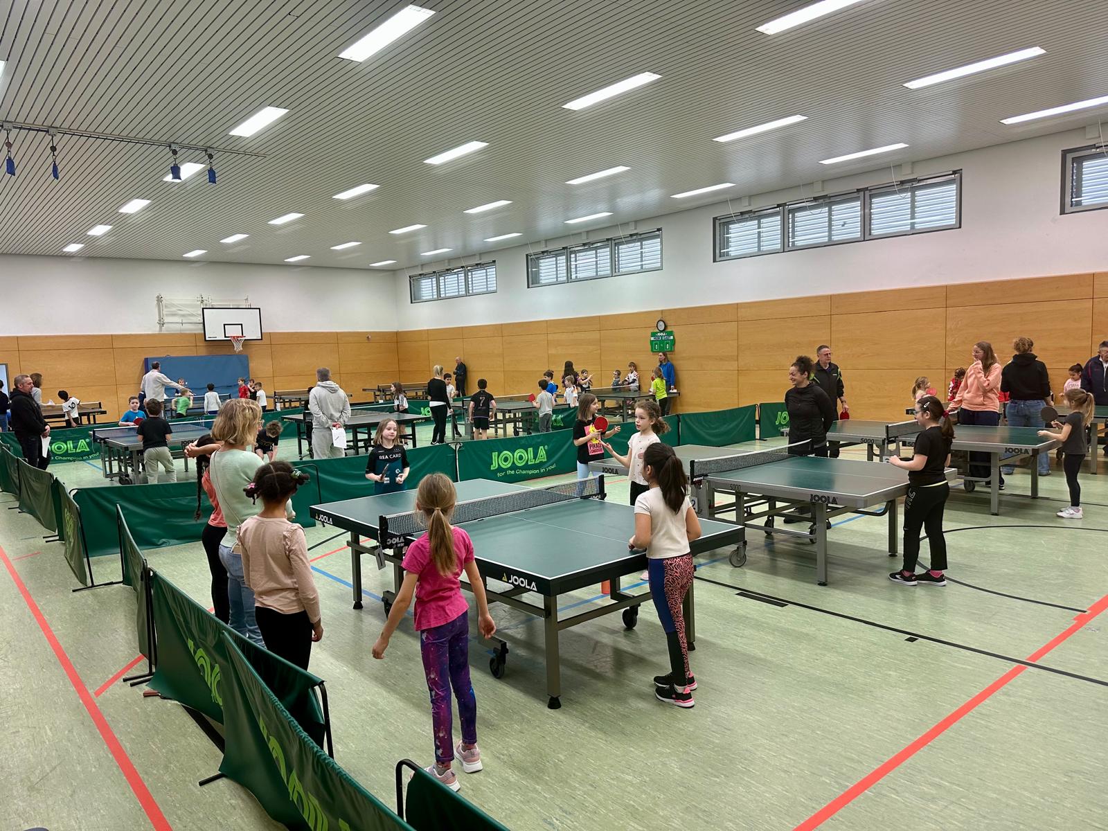 An 12 Tischen, die von sieben Helfern vom TSV schon früh morgens aufgebaut wurden, wurden die Sieger in den einzelnen Jahrgängen ausgespielt. Die GrundschülerInnen wurden in zwei Altersgruppen – acht Jahre und jünger und in die zweite Gruppe für neun- und zehnjährige eingeteilt. Hierbei wurde dann nochmals in Schüler und Schülerinnen unterteilt, sodass in vier Gruppen die Sieger ermittelt wurden. Einige Eltern sowie die Helfer agierten als Schiedsrichter und Gruppenprotokollant. Sie hatten sichtbar viel Freude am Ehrgeiz und der Spielfreude der 95 teilnehmenden SchülerInnen. Begonnen wurde mit den Gruppenspielen der 8-jährigen und jünger. Hier gab es insgesamt 11 Gruppen mit jeweils 5-6 Schülern. Danach fanden die Gruppenspiele der 9 und 10-jährigen statt. Als diese ausgespielt waren, ging es in die Hauptrunde. Zu den Finalspielen bauten die Helfer die Tische ab und es wurden zwei Spielboxen mit Zählgeräten aufgebaut und alle Schüler säumten rund um die Boxen als Zuschauer die Halle und feuerten ihre Klassenkameraden/innen an.