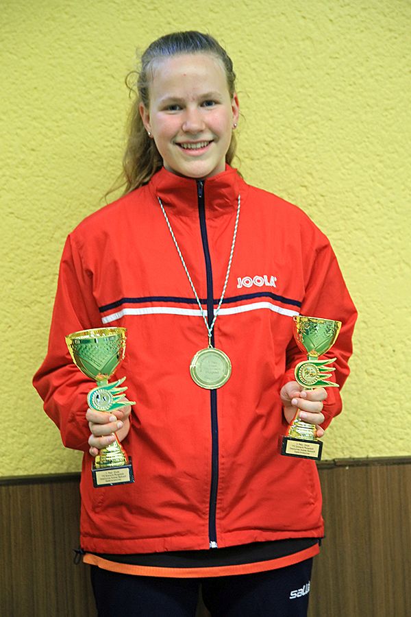 Katharina nahm in den Konkurrenzen weibl. Jugend und A-Schülerinnen jeweils im Einzel und Doppel teil. Dabei schloss sie das Turnier im A-Schülerinnen Doppel mit Lilly Kern vom TTC Eintracht Pfungstadt auf dem 1. Platz ab. Im A-Schülerinnen Einzel erreichte sie einen tollen 2. Platz. Im System Jede gegen Jede musste sie sich nur Lilly Kern mit 0:3 geschlagen geben, ansonsten konnte sie die weiteren 4 Spiele gegen ihre Gegnerinnen gewinnen. Im Jugend-Einzel Endspiel konnte sie sich dann revanchieren und den Sieg mit 3:0 gegen Lilly Kern für sich holen, was auch hier der 1. Platz bedeutete.