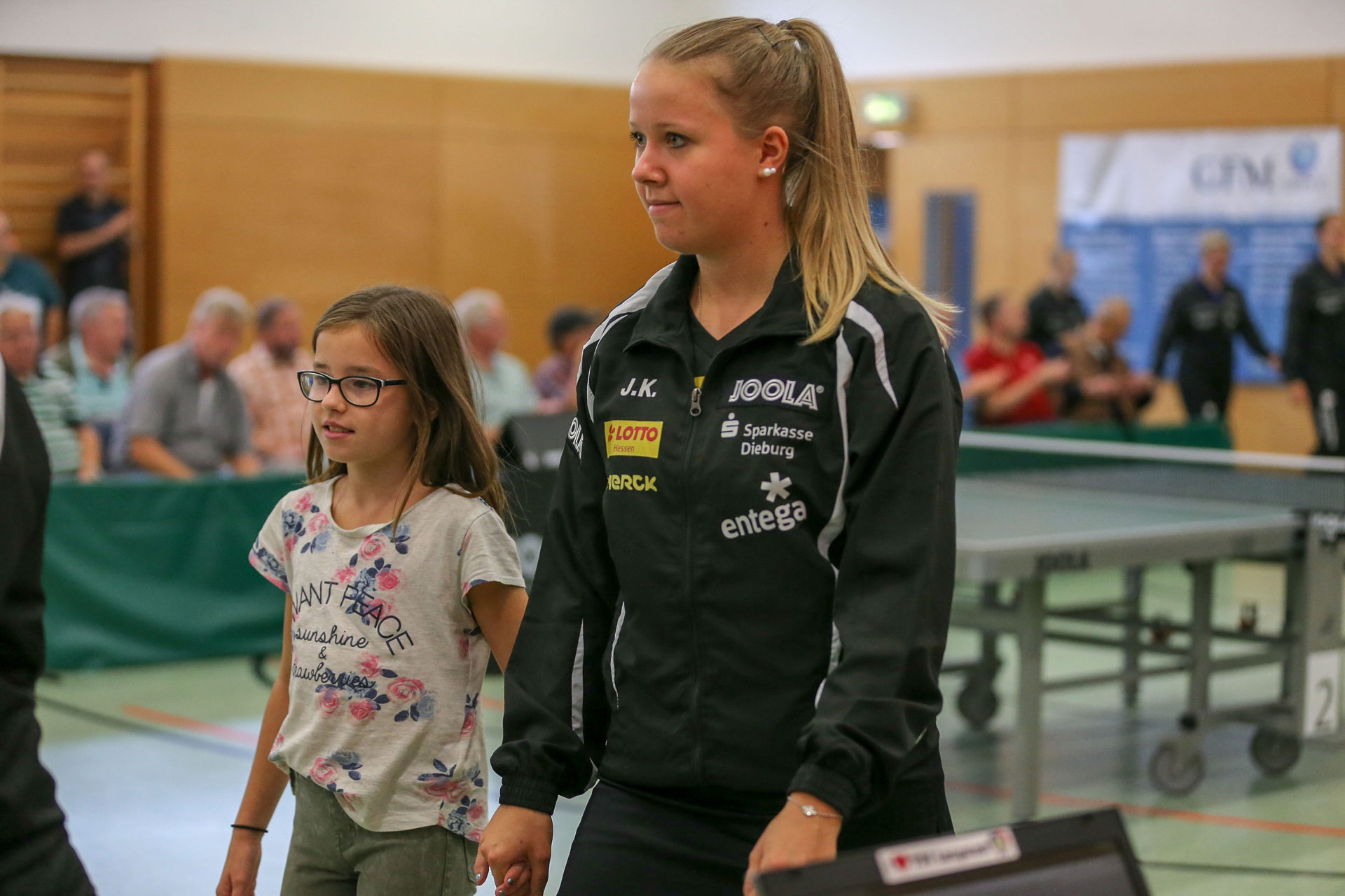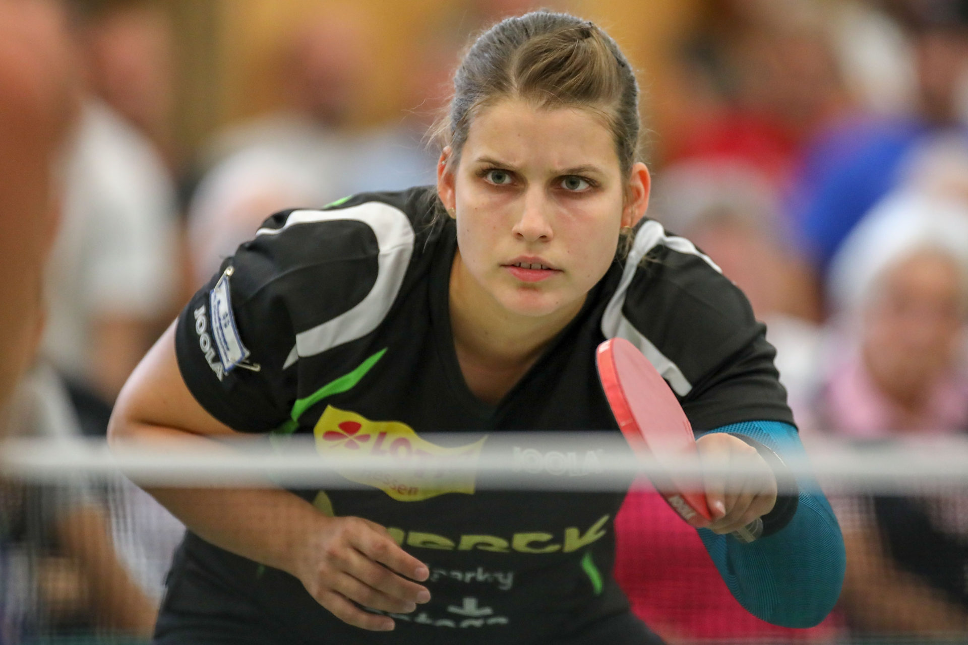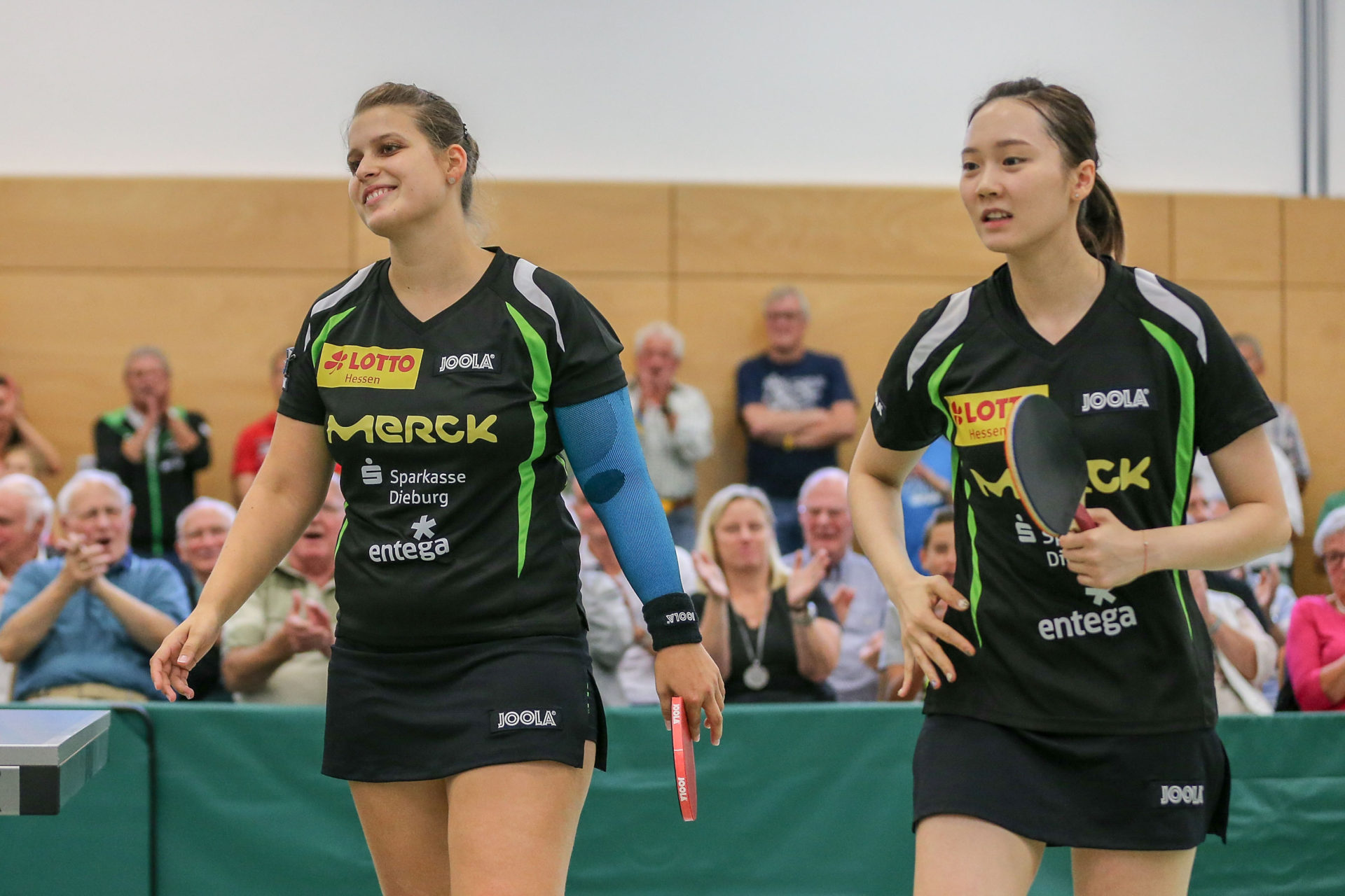 Was die Zuschauer dann beim Spiel Petrissa Solja gegen Quianhong Gotsch erlebten, war der Wahnsinn. „Ich habe noch nie gegen sie gewonnen“, so die Aussage von Petrissa vor dem Spiel. Davon war aber im ganzen Spiel nichts zu merken. „Sie war absolut auf Augenhöhe mit Gotsch“ befand auch Coach Thomas Hauke. Nach gewonnenem ersten Satz, führte Petrissa im zweiten mit 9:6, ehe Gotsch mit ihrer ganzen Cleverness den Satz noch holen konnte. Nach verlorenem 3. Satz kämpfte Petrissa unverdrossen weiter und holte sich unter dem tosenden Beifall der Zuschauer den 4. Satz. Das Spiel wiegte dann im Entscheidungssatz hin und her. Keine der beiden Kontrahentinnen konnte sich entscheidend absetzen. Gotsch holte dabei immer wieder die unmöglichsten Bälle noch weit hinter dem Tisch. In der Verlängerung unterlag Petrissa dann etwas unglücklich mit 11:13. Trotzdem wurde sie frenetisch von den Zuschauern gefeiert, denn das war mit Abstand das beste Spiel was jemals in der Langstädter Halle zu sehen war.