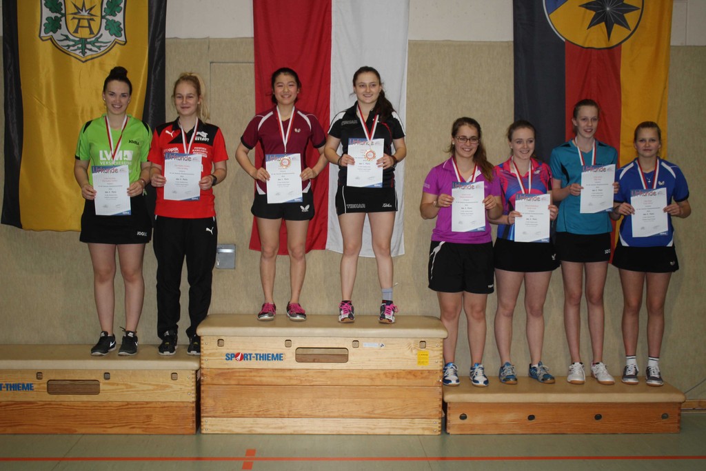 Nina Segeth konnte dagegen einen Podestplatz im Doppel mit Ronja Löbig von der DJK BW Münster erspielen. Sie mussten sich erst im Halbfinale den späteren Hessenmeisterinnen Kempa/Kriesbach geschlagen geben. Auch im Einzel kam sie als zweitplatzierte mit 2:1 Siegen aus ihrer Gruppe in die Endrunde. Im Achtelfinale war dann aber gegen die spätere drittplatzierte Amelie Kempa Schluss.