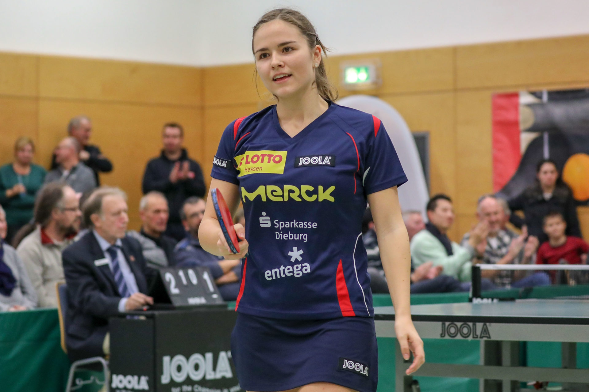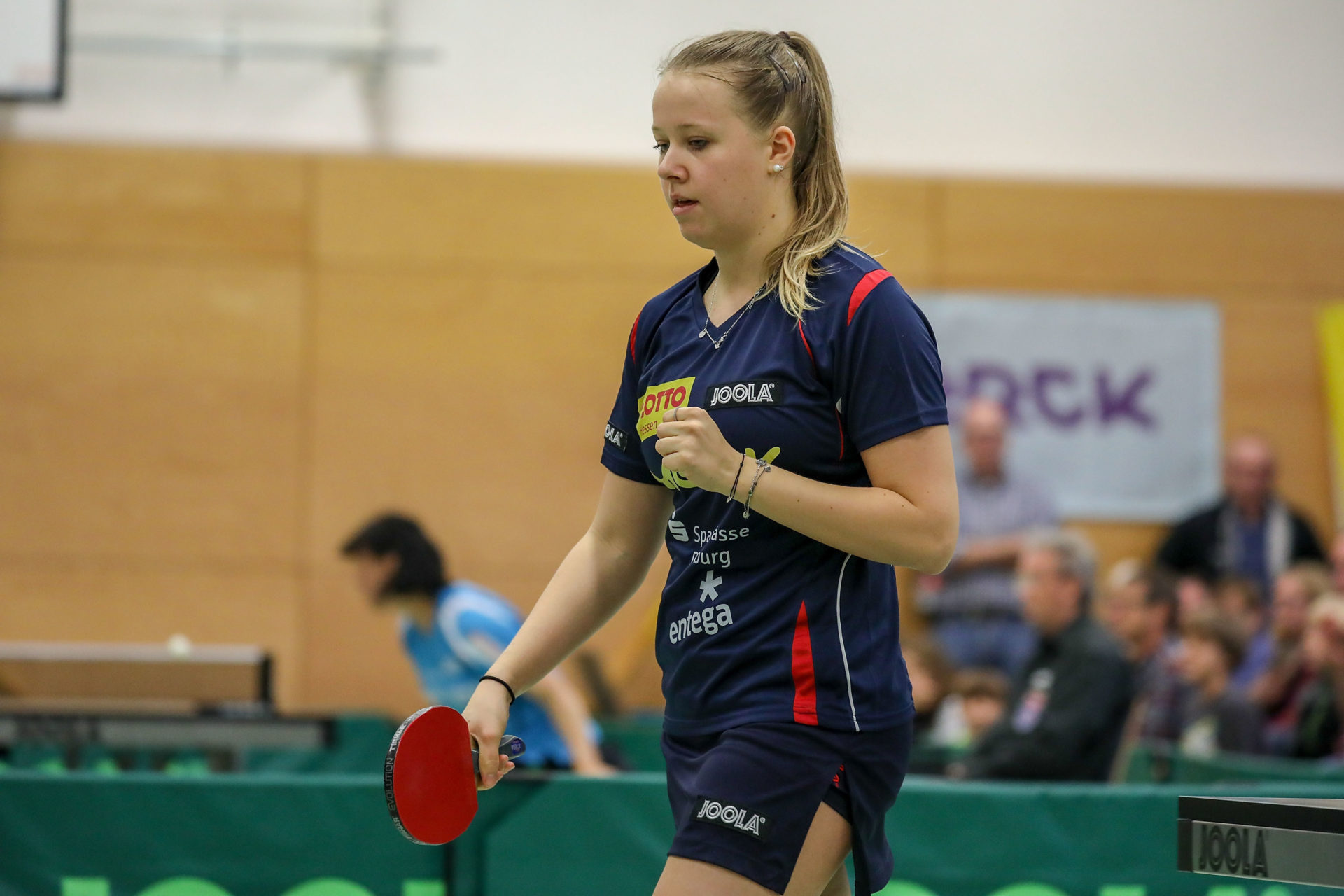 Im hinteren Paarkreuz schlugen sich Monika Pietkiewicz und Janina Kämmerer sehr gut. Beide gewannen ihr Spiel im ersten Durchgang zur zwischenzeitlichen 4:2 Führung. Monika mit 3:2 Sätzen gegen die erfahrene Yang Henrich. Die gute Form vom Bad Driburg konnte Monika somit auch gegen Anröchte zeigen. Sehr erfreulich war der erste Erfolg in der 1. Liga für Janina Kämmerer. Das Eigengewächs des TSV zeigte dabei eine ganz starke kämpferische Leistung gegen die zweifache Ü 50 Weltmeisterin Jing Tian-Zörner. Nach 0:2 Satzrückstand kämpfte sie sich verbissen ins Match zurück. Im Entscheidungssatz hatte sie diesmal dann auch das Quäntchen Glück was in früheren Begegnungen fehlte. Janina strahlend:“Es ist ein tolles Gefühl vor den heimischen Fans endlich das erste Spiel in der Bundesliga zu gewinnen. Heute hatte ich sicher auch etwas Glück bei meinem Erfolg, aber ich habe immer an den Sieg geglaubt und wurde endlich einmal belohnt.“
