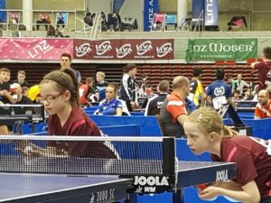 Im Team spielte Nina mit Josephina Neumann. Betreut wurden beide von Cornelia Neumann-Reckziegel – die ebenfalls schon für den TSV erfolgreich an die Tische ging. Zunächst starteten die beiden Mädels sehr verhalten und waren doch sehr beeindruckt von der großen Kulisse bei dieser Veranstaltung. Sie verloren ihr erstes Spiel mit 0:3 gegen die Slowakei. Im zweiten Spiel spielten sie besser und gewannen 3:0 gegen Österreich. Somit hatten sie den Sprung in die Endrunde geschafft, was das erklärte Ziel war, so Cornelia Neumann-Reckziegel.