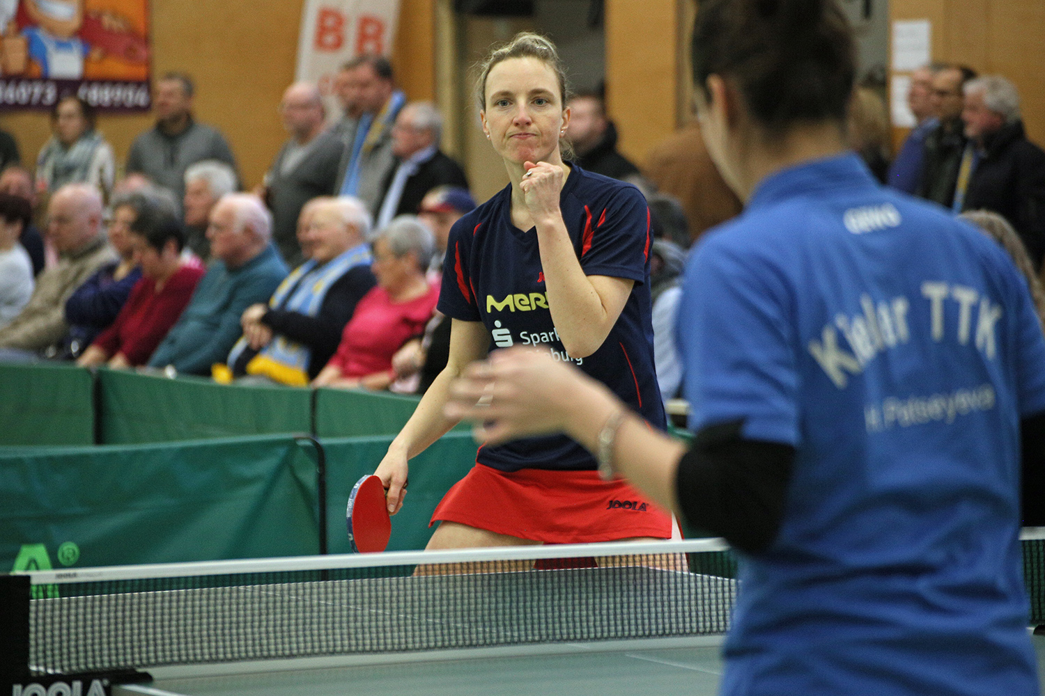 Im vorderen Paarkreuz hat Kiel mit Tamara Tomanova (Tschechien) und Hanna Patseyeva (Weissrussland) zwei Nationalspielerinnen in ihren Reihen. Die an diesem Tag überragende Janina Kämmerer schaffte jedoch gegen beide Gegnerinnen jeweils einen 3:1 Erfolg. Auch Sonja Busemann zeigte eine gute Leistung und gewann im Entscheidungssatz gegen Tomanova. Im hinteren Paarkreuz spielte die indische Schülermeisterin Chitale zwei tolle Begegnungen. Mit druckvollen Angriffsbällen setzte sie dabei ihren Gegnerinnen immer wieder zu. Sowohl gegen Jule Wirlmann als auch Larissa Schmidt gelang ihr ein überzeugendes Spiel und gerade der Siegpunkt gegen Jule Wirlmann konnte sie unter großem Jubel der Fans erzielen, da fiel die Niederlage von Kerstin Segeth im ersten Einzeldurchgang gegen Jule Wirlmann nicht ins Gewicht.