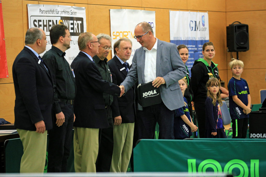 Zur obligatorischen Übergabe der Spielbälle sehen sie auf dem Foto Herrn Markert von der Sparkasse bei der Übergabe an den Oberschiedsrichter.